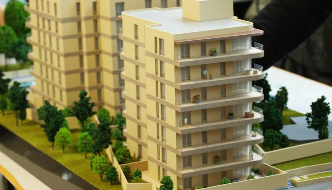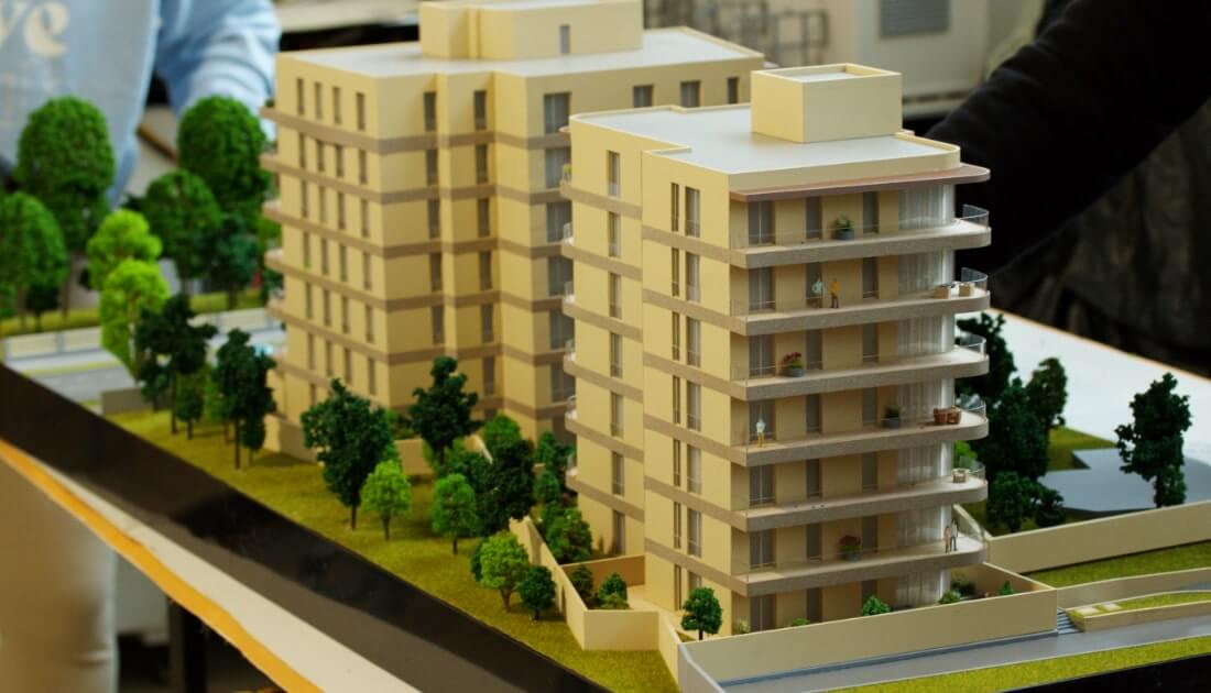 C’est une maquette d’architecture d’un complexe résidentiel moderne. La maquette comprend deux immeubles d’habitation de hauteur moyenne, chacun caractérisé par des lignes géométriques épurées, des façades beige clair et des balcons continus qui soulignent l’ouverture et le design contemporain.