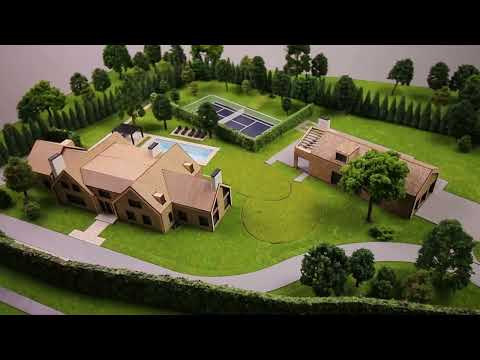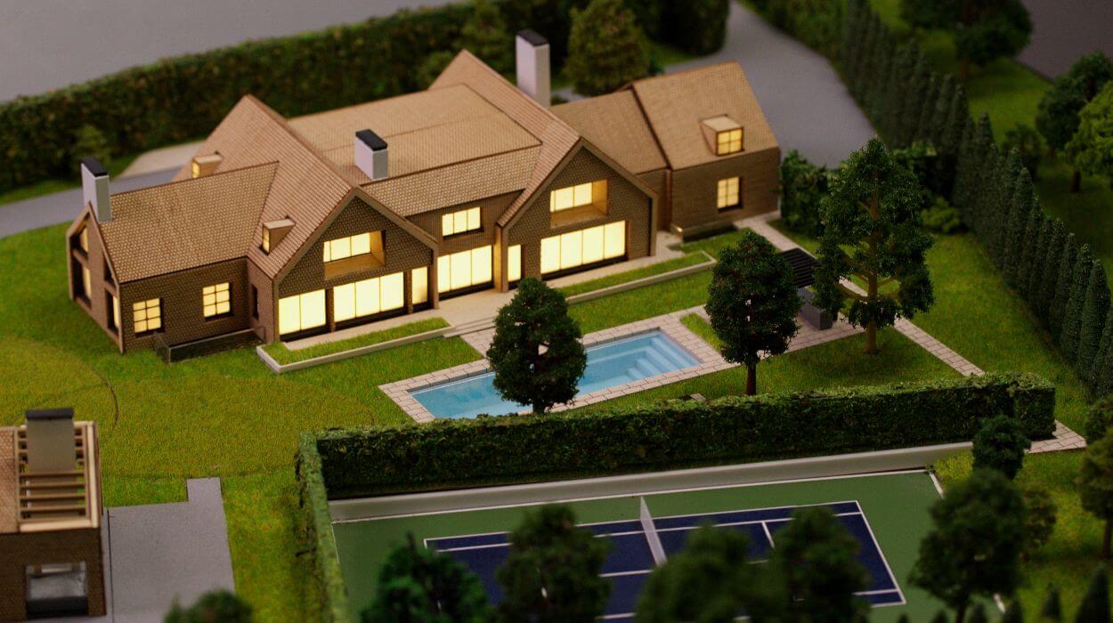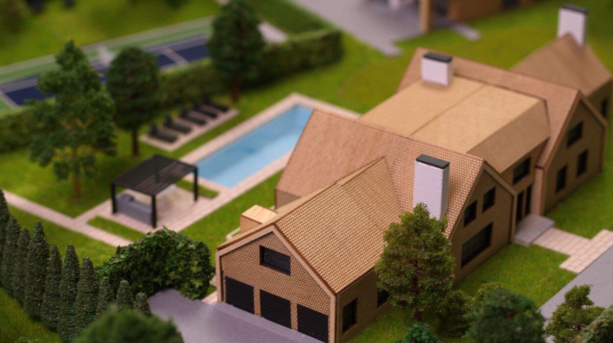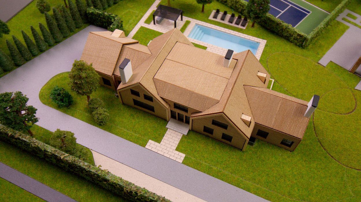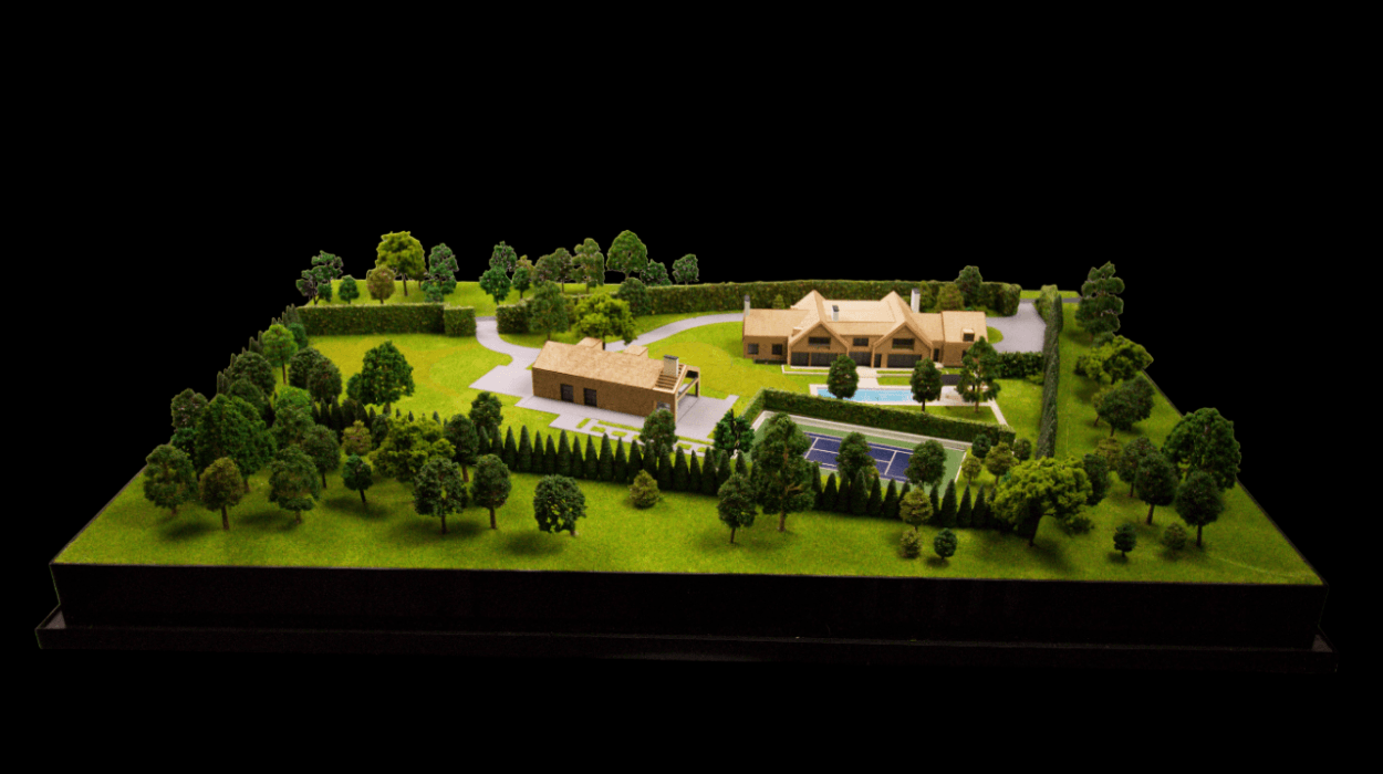 Cette maquette architecturale présente un domaine résidentiel planifié, comprenant une villa principale et une structure secondaire à toit à pignon situées au cœur d’un paysage verdoyant et étendu.