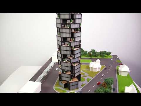 Cette maquette architecturale représente un immeuble de grande hauteur, une tour résidentielle, inséré dans un environnement urbain simplifié. L’élément central est la tour elle-même, qui arbore un design contemporain saisissant. Elle semble composée d’une multitude de modules rectangulaires empilés ou imbriqués, chacun doté d’intérieurs illuminés, évoquant l’idée d’unités d’habitation ou de bureaux individuels.