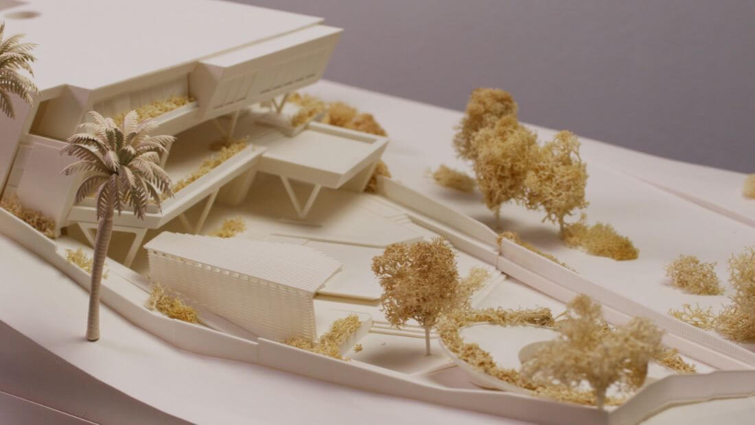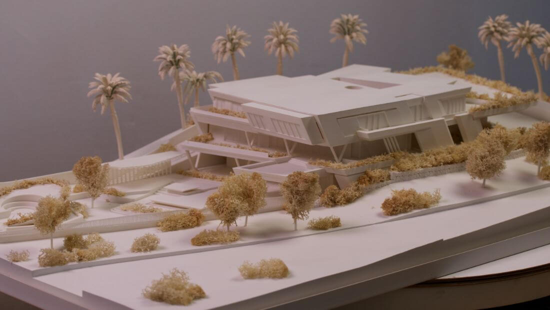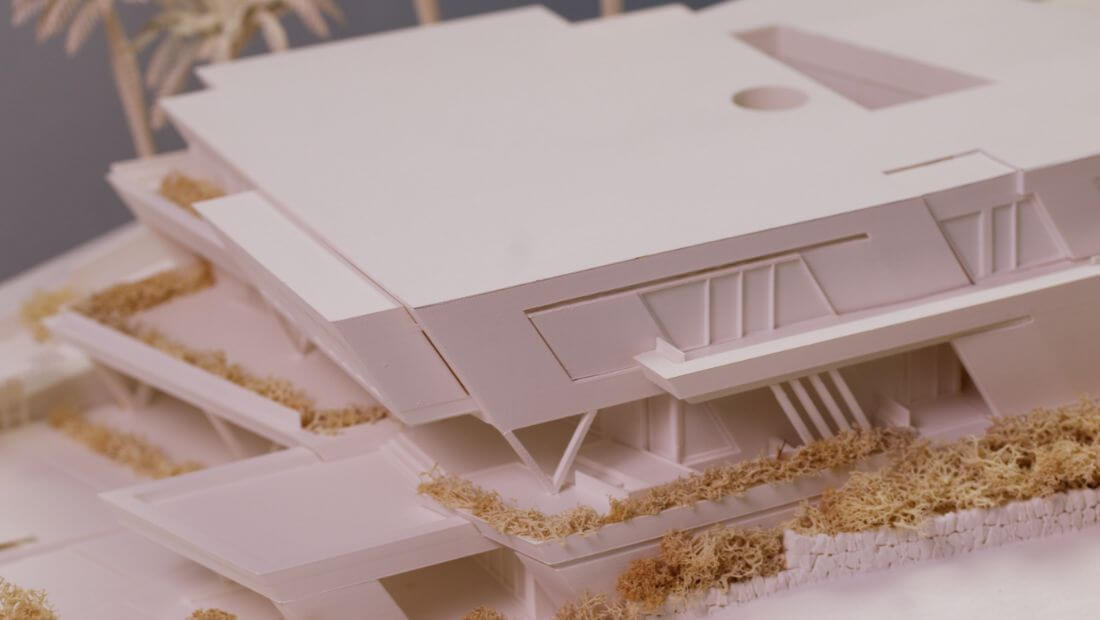 L’intégration de la végétation, des allées et des palmiers met en évidence la relation entre les espaces intérieurs et extérieurs, soulignant un art de vivre en harmonie avec la nature. La maquette illustre non seulement le caractère architectural de la maison, mais aussi sa fluidité spatiale et son lien avec le terrain.