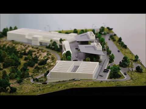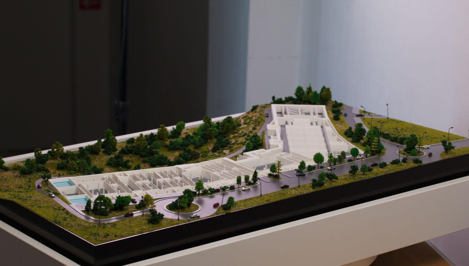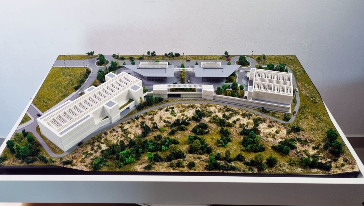 Entourée d’un aménagement paysager réaliste, comprenant routes, véhicules et végétation, la maquette illustre la parfaite intégration du centre de données dans son terrain naturel. La composition sur plusieurs niveaux et la pente douce du site soulignent la relation entre architecture et topographie.