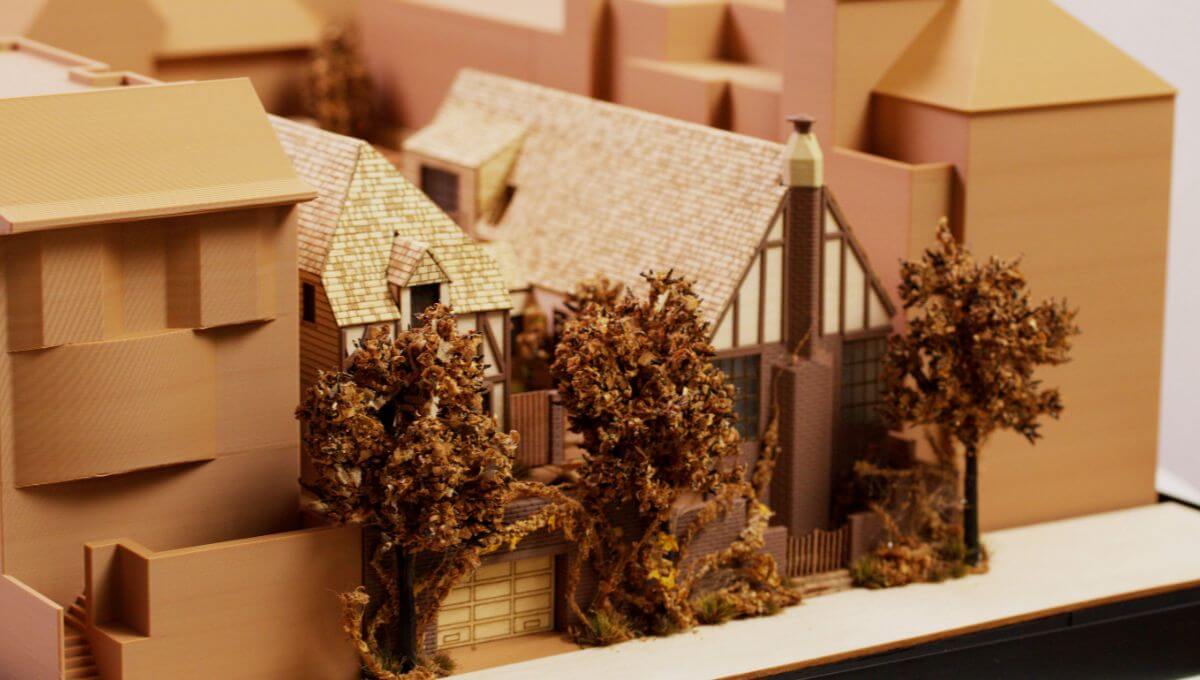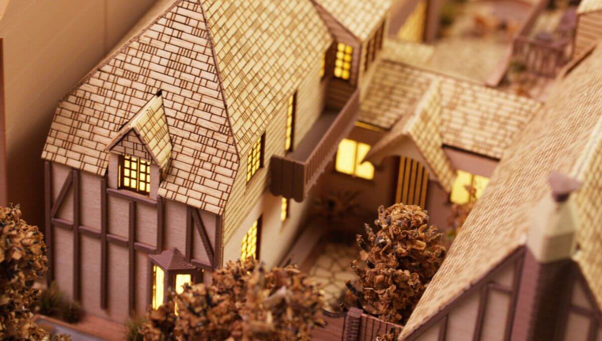 Sur le plan technique, la maquette (à l’échelle 1:50) se concentre sur une restitution fidèle des textures : l’utilisation de différentes densités de carton pour la structure principale, de placage bois pour les éléments de colombage, et de matériaux composites pour l’aménagement paysager mature.