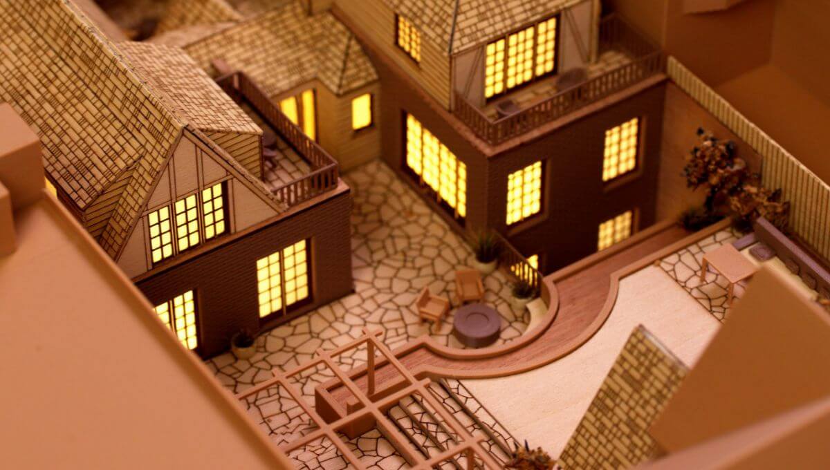 La maquette parvient à saisir bien plus que la simple volumétrie du bâtiment ; elle évoque une atmosphère chaleureuse et pérenne, celle d’un véritable « foyer ». Le Tudor Revival est un style architectural populaire du début du XXe siècle, en particulier dans les années 1920 et 1930, qui romantise les cottages et manoirs médiévaux anglais à travers des éléments distinctifs tels que des toitures fortement inclinées à multiples pignons, des colombages décoratifs, de grandes cheminées massives et un mélange de matériaux comme le stuc, la brique et la pierre, créant une esthétique « Old World » ou de conte de fées, en réaction aux excès de l’architecture victorienne.