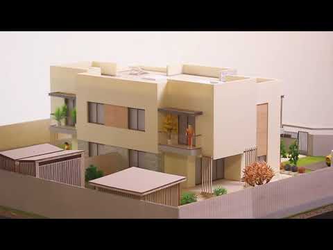 Cette maquette présente une maison de type duplex, au design contemporain et résidentiel. L’accent est mis sur la façade avant, l’aménagement paysager et les détails de la vie quotidienne. La maison est une structure à deux niveaux, avec un toit plat et un style architectural moderne, caractérisé par des lignes épurées et des volumes distincts.